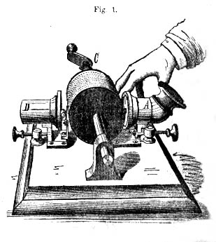 It might be said that at this point the machine has already become a complete phonograph or sound writer, but it yet remains to translate the remarks made. It should be remembered that the Marey and Rosapelly, the Scott, or the Barlow apparatus, which we recently described, proceed no further than this. Each has its own system of caligraphy [sic], and after it has inscribed its peculiar sinuous lines it is still necessary to decipher them. Perhaps the best device of this kind ever contrived was the preparation of the human ear made by Dr. Clarence J. Blake, of Boston, for Professor Bell, the inventor of the telephone. This was simply the ear from an actual subject, suitably mounted and having attached to its drum a straw, which made traces on a blackened rotating cylinder. The difference in the traces of the sounds uttered in the ear was very clearly shown. Now there is no doubt that by practice, and the aid of a magnifier, it would be possible to read phonetically Mr. Edison's record of dots and dashes, but he saves us that trouble by literally making it read itself. The distinction is the same as if, instead of perusing a book ourselves, we drop it into a machine, set the latter in motion, and behold! the voice of the author is heard repeating his own composition.