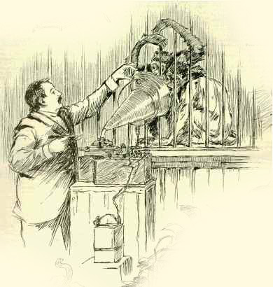 It was a Barmecidian feast, but satisfactory, at least to Mr. Garner, for a cylinder was obtained. Next in order was the recording of the monkey sound for thirst. Jake, the keeper, poured out milk into the pan in a niggardly manner. The twitter the monkeys made was a less positive sound than when the apple was visible. The whole company had, however, either recognized the milkman with his tin can, or had smelt the milk. The poor little chaps rushed to the pan, where there was barely enough for one, and now a clutter of monkeys, like Oliver, cried for "more." At once the phonograph was put in position, and a second page in the simian vocabulary was set up in sounding type. The final chapter was a copy in short-hand of monkeys in a tip-top rage. A few passes made by the keeper sent the whole cage into an ecstasy of passion. The creatures screeched, raved, scolded, and their bad temper seemed infectious, for distant monkeys participated in the row, and bounced about, and were in paroxysms of anger. The revolving cylinder took in all the clamor in an unruffled manner.