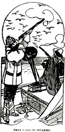 “I puts th’ weary blackwing out o’ trouble, an’ Algernon Pinckney reverses his machine. ‘Now, me wise guy-de,’ says he, ‘we’ll get some duck shootin’.’ An’ he p’ints his blamed machine at th’ morass off th’ port side, sticks it in th’ prow an’ starts it goin’. I never heard such duck calls in all my life. Pinckney would speed ’er up every onct in awhile, an’ you’d think 500 flocks was holdin’ high jinks. You oughter seen th’ live ducks an’ geese take Algernon Pinckney’s phonygraft bait. They come in swarms that clouded th’ river. There was a thousand birds in gunshot in no time. I got 150 in three-quarters of an hour. Even Pinckney shot down twenty, an’ I think he fired every other charge at me or inter th’ bottom o’ th’ boat.