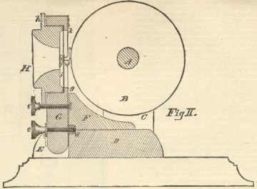The diaphragm support, G, is � inch thick and 3 inches wide, and is bored out to receive the diaphragm, f, and mouthpiece, H.  The opening in the support, G, is of two diameters; the larger part, which receives the mouthpiece and diaphragm, is 2 3/8 inches in diameter, and the smaller part exactly 2 inches, leaving a flange, g, which is 3-16 in. wide and 1/8 in. thick, and leaving 2 inches of the diaphragm exposed.