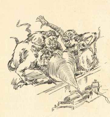 It was a Barmecidian feast, but satisfactory, at least to Mr. Garner, for a cylinder was obtained. Next in order was the recording of the monkey sound for thirst. Jake, the keeper, poured out milk into the pan in a niggardly manner. The twitter the monkeys made was a less positive sound than when the apple was visible. The whole company had, however, either recognized the milkman with his tin can, or had smelt the milk. The poor little chaps rushed to the pan, where there was barely enough for one, and now a clutter of monkeys, like Oliver, cried for "more." At once the phonograph was put in position, and a second page in the simian vocabulary was set up in sounding type. The final chapter was a copy in short-hand of monkeys in a tip-top rage. A few passes made by the keeper sent the whole cage into an ecstasy of passion. The creatures screeched, raved, scolded, and their bad temper seemed infectious, for distant monkeys participated in the row, and bounced about, and were in paroxysms of anger. The revolving cylinder took in all the clamor in an unruffled manner.