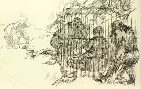 WHEN I was a child, seated on my great-grandam's knee, she told me of the Hessians that she had seen marching through Philadelphia streets, and also of a monkey that she once saw in Surinam, whose business it was to carry pails of water on its head to an exacting Dutch housewife. My patriotism might have been latent as far as the Hessians were concerned, but my curiosity in regard to monkeys probably dated from that early age. My mind, it may be said, has always been in a tabula rasa condition, prepared to accept at least this much, that monkeys were not to do things "out of the way," but in the way, of humanity. When, upon what I believe to be the most unimpeachable authority, I am told that Sally, the chimpanzee of the London Zoo, when she held ten straws in her hand, and you asked her for seven, would take away three, and unhesitatingly give you the remainder, after the first mental stagger I accept Sally as the developing simian arithmetician. I have lingered for a long time over a certain page in one of Miss Bird's books of travel, where she tells of dining in company with an ape or two somewhere in Malacca, and how the creatures behaved with singular decorum, with just as much propriety as well-bred children. The fact of the tempering of the strongest of animal instincts--that ravening greed for food common to brutes, and particularly to monkeys--made a strong impression on me. I was not, then, completely bowled over when Mr. F. S. Church, the artist, telegraphed me about as follows: "Come to the Zoo, and attend conversazione between Mr. Garner and monkeys."