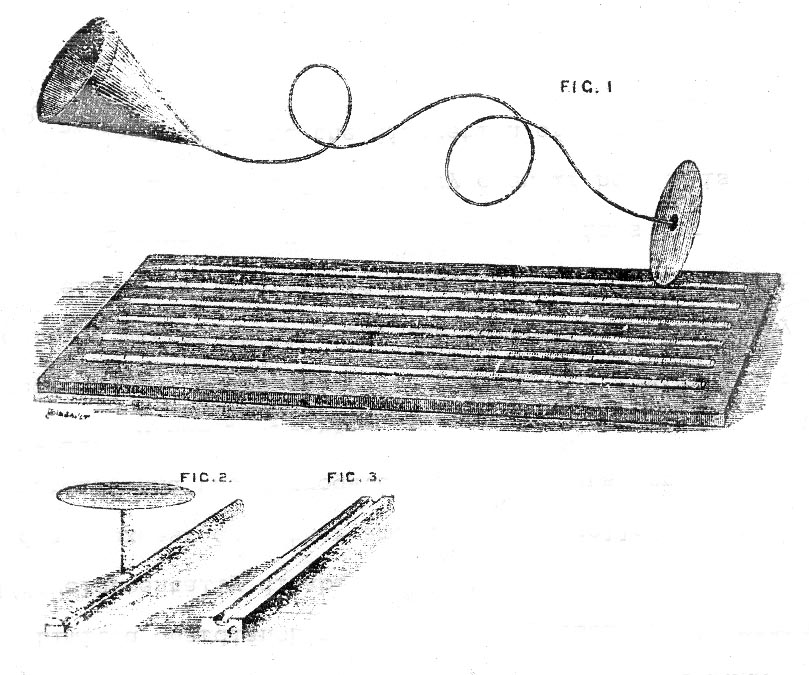 The whole apparatus which is represented in Fig. 1 consists, first, of a hollow cone of pasteboard about 1 ½ inch in diameter, whose apex is connected to the center of a similar-sized pasteboard disc by means of a lead wire about 16 inches long; and, second, of a small board or tablet, on which is fixed one, or a larger number of short lengths of lead wire, each of which bears upon its upper surface a phonographic embossed record corresponding to a certain word or sentence, by which it was originally produced by a process to be described further on.